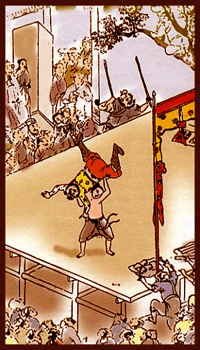 “Beat (a drum) platform”. Is a raised fighting platform, without railings, where often fatal weapons and bare knuckle martial arts tournaments were once held. “Sanctioned” matches were presided over by a referee on the platform and judges on the sides. Fighters would lose if they surrendered, were incapacitated, were thrown or otherwise forced from the stage. The winner would remain on the stage (as its “owner”) unless ousted by a stronger opponent. If there were no more challengers, they would become the champion. Private duels on stage had no rules and were sometimes fought to the death.